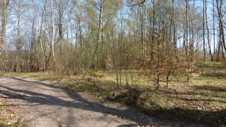 | 28. Znów nieco dalej na wschód (w tle przewalone drzewo z poprzedniej fotki), na wysokości tablicy informującej o rezerwacie przyrody. Widok w kierunku Berlina. Typ W. | 29. Polno-leśna droga wchodząca na ślad autostrady po północnej stronie. Po lewej pryzmy ziemi, po prawej koniec nieukończonego wykopu. Widok w kierunku Królewca. Typ W. |