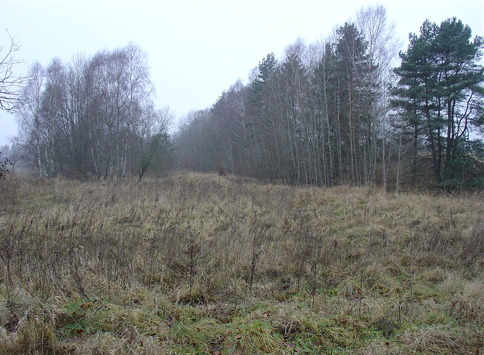 | 60. Okolice tego samego miejsca późną jesienią. Po prawej stronie widać wyraźne pryzmy ziemi. Typ E. | 61. Wygładzony teren pod jezdnię autostrady koło wsi Brzeźniak. Ponoć po wojnie leżały tu jeszcze wagoniki, lokomotywy i inne przyrządy służące do budowy dróg. Typ D. |