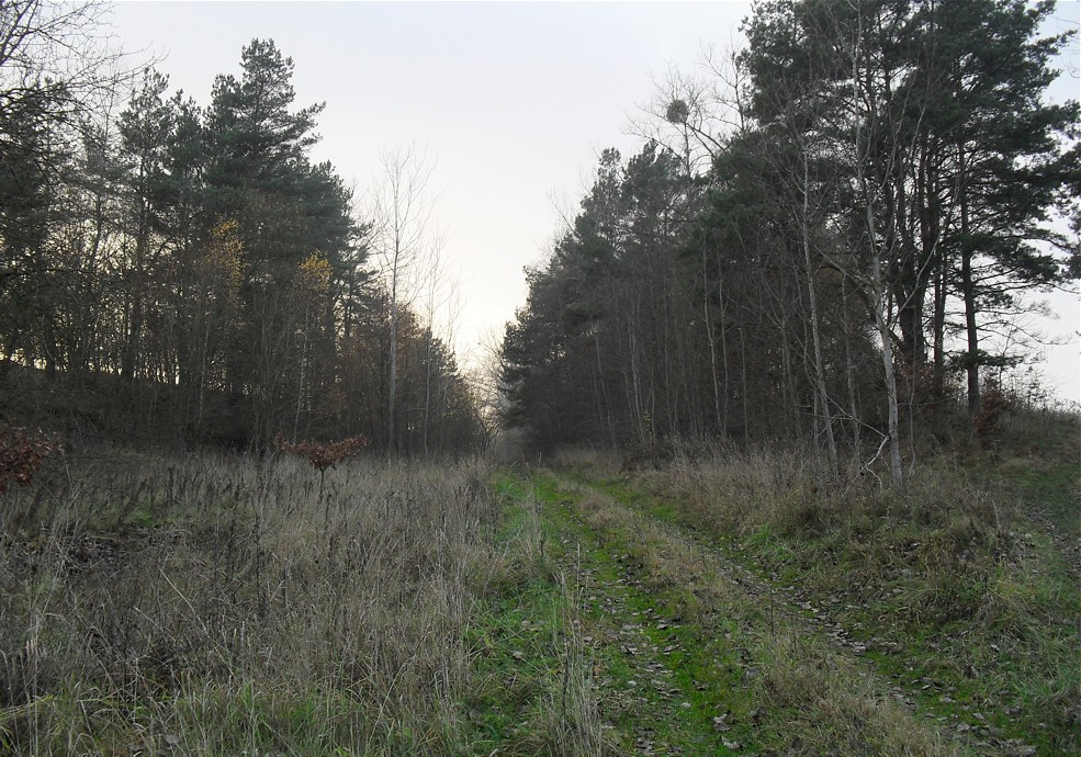 | 76. Drogi łączą się przed stawem, który utworzył się (i został zagospodarowany) na śladzie berlinki. Typ U. | 77. 200-250 metrów dalej berlinka widziana w kierunku DW148 w Gajewku (dawniej Dębina), gdzie miał być węzeł Dramburg. Typ L. |