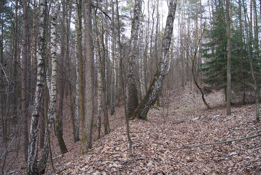 | 205. W tle, na lewo od traktora pryzmy z poprzedniego zdjęcia. Po prawej nieukończony wykop w miejscu niedoszłej północnej jezdni. Zaorane pole po trochę wcześniejszej wycince drzew. Widok na północny wschód. Typ Y. | 206. Ładnie odsłonięte północne pryzmy ok. 250 m od drogi Knyki - Stary Chwalim (widoczna w tle). Po prawej zaorane pole jeszcze do niedawna pokrywał lasek. Dalej na prawo (za dwoma brzozami) wykop. Widok w kierunku Królewca. Typ Y. |